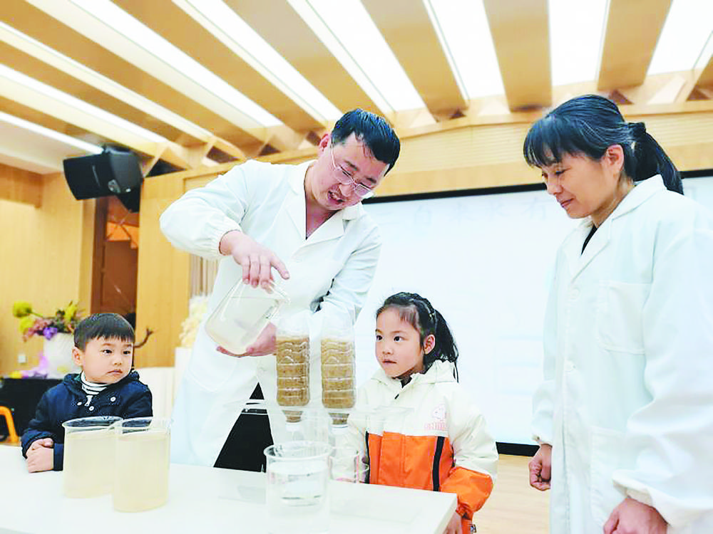 圖為志愿者現(xiàn)場教小朋友做凈水實驗。