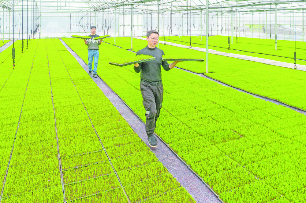 3月25日,佛堂鎮(zhèn)農業(yè)“雙強”示范區(qū)內,育秧流水線全速運轉,一個個育苗盤隨后被整齊有序地擺放在育秧大棚中。 近年來,佛堂鎮(zhèn)聯合義烏市農業(yè)開發(fā)有限公司大力建設農業(yè)“雙強”示范區(qū)育秧中心項目,先后完成了現代育秧大棚、水肥一體系統(tǒng)設施、育秧流水線的建設和鋪設。其中,育秧流水線由浸種催芽機、供盤機、育秧播種流水線、自動疊盤機、秧苗傳送線、暗化車間組成,是一套集機械化、自動化、智能化、數字化于一體的智慧農業(yè)設施。育秧流水線能夠控光、控濕、控溫,讓早稻育秧成苗率達98%以上,同時可以節(jié)省80%以上勞動力。 圖為育苗車間秧齊苗壯。 |