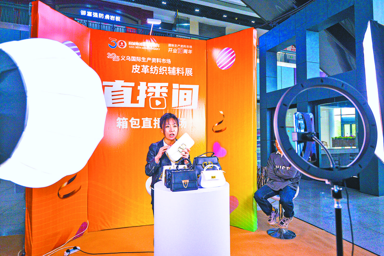 4月14日上午,在義烏國際生產(chǎn)資料市場皮革紡織輔料展上,一場箱包專場直播正在火熱進(jìn)行。