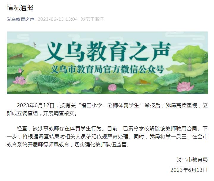 義烏市教育局13日通過其官方微信公眾號(hào)發(fā)布情況通報(bào)稱,2023年6月12日,接有關(guān)“福田小學(xué)一老師體罰學(xué)生”舉報(bào)后,義烏市教育局高度重視,立即成立調(diào)查組,開展調(diào)查核實(shí)。 經(jīng)查,該涉事教師存在體罰學(xué)生行為。目前,已責(zé)令學(xué)校解除該教師聘用合同。下一步,將根據(jù)調(diào)查結(jié)果對(duì)相關(guān)人員依紀(jì)依規(guī)嚴(yán)肅處理。同時(shí),義烏市教育局將舉一反三,在全市教育系統(tǒng)開展師德師風(fēng)教育,切實(shí)強(qiáng)化教師隊(duì)伍監(jiān)管。 ![]() |
