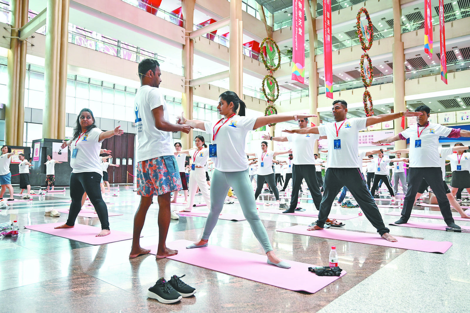“瑜伽迎亞運,尖貨傳五洲!彪S著杭州第19屆亞運會日益臨近,昨日,第9屆國際瑜伽節(jié)暨義烏品牌出海季系列活動在義烏國際商貿城四區(qū)啟動。300余名中外瑜伽愛好者一字排開、整齊列隊,在瑜伽教練帶領下,展示充滿韌勁柔美的瑜伽表演。