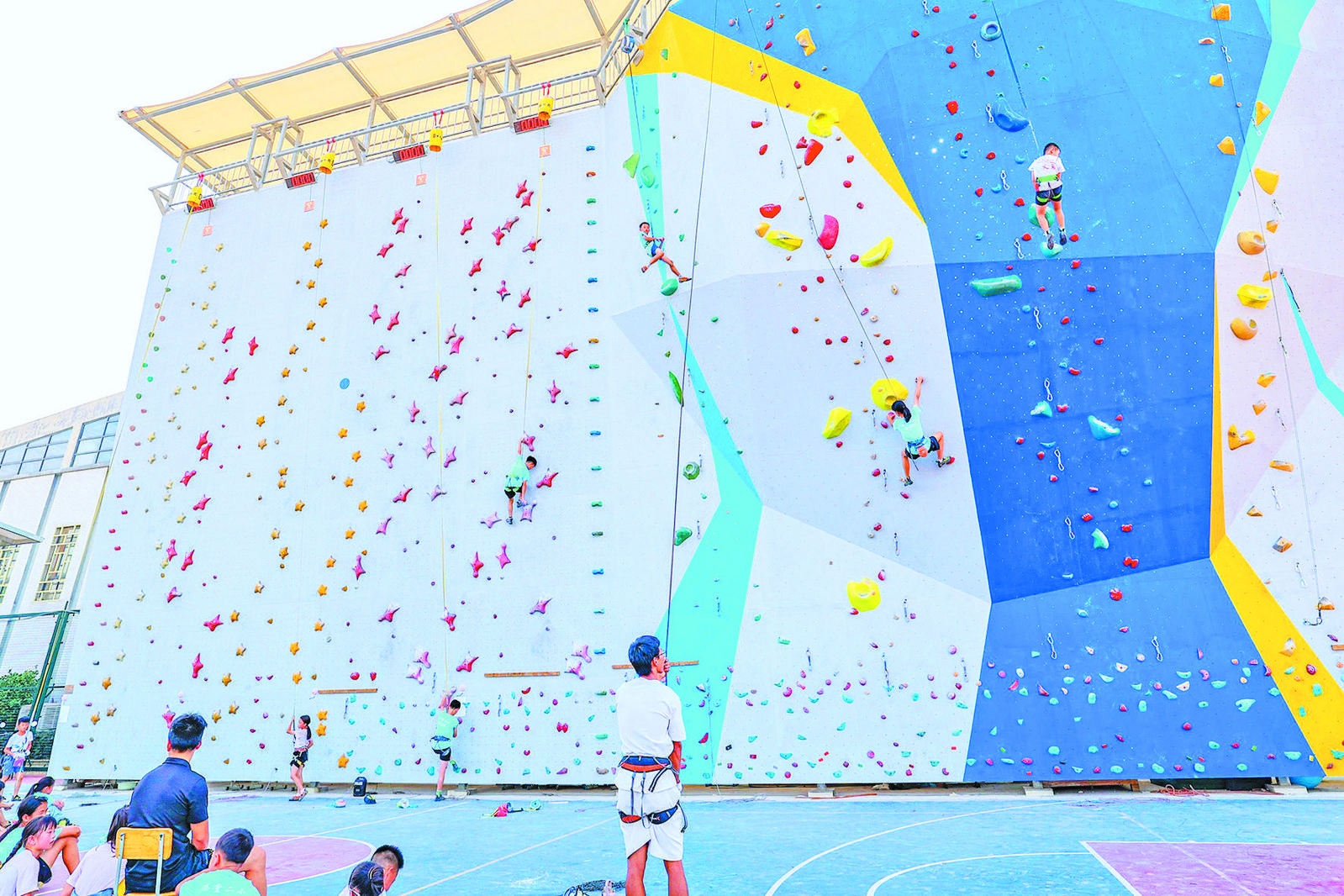 7月7日下午3時,在佛堂鎮(zhèn)第二小學,該校攀巖健兒抓緊時間練習攀巖項目。