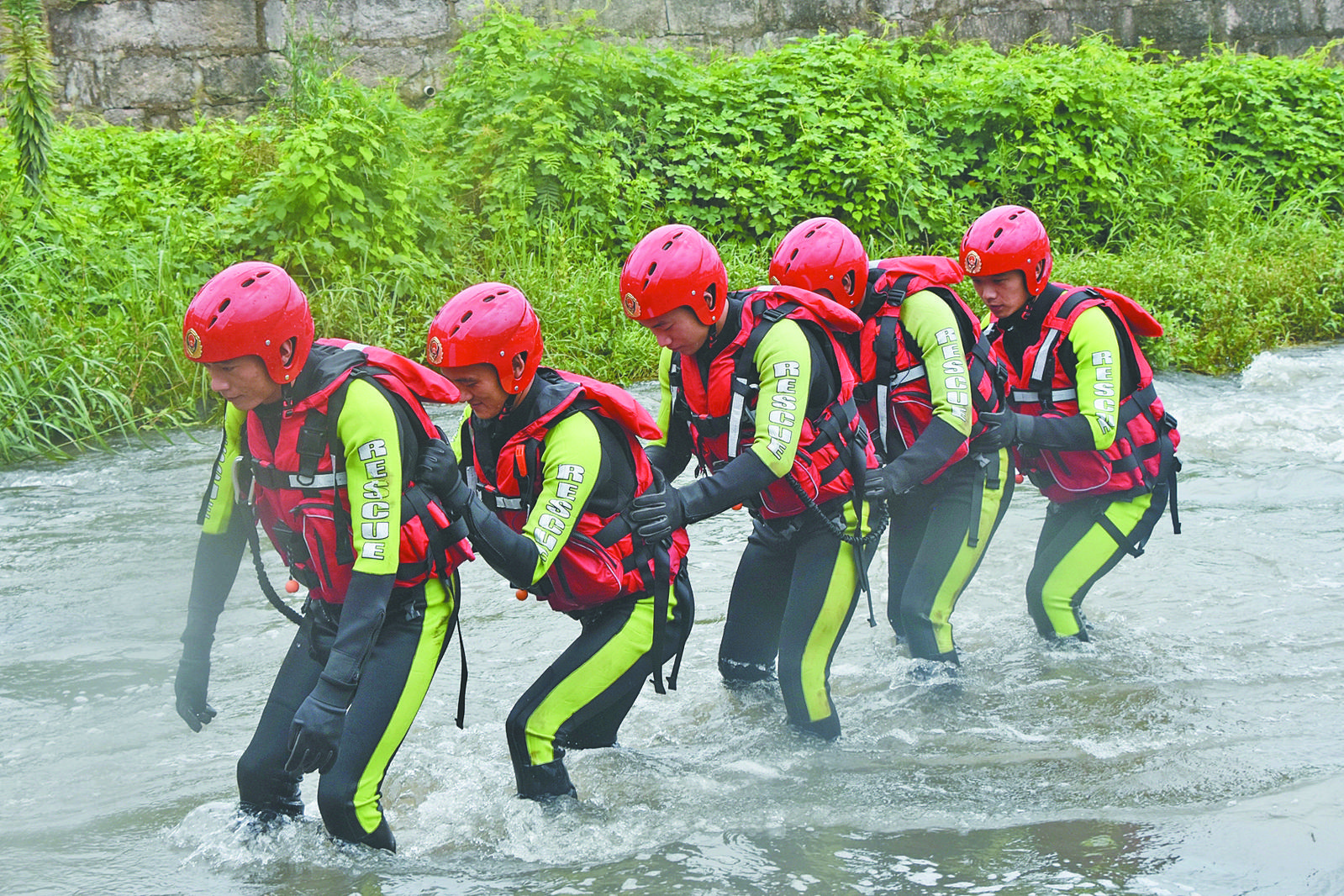 受臺(tái)風(fēng)的影響,我們經(jīng)常會(huì)遇到一些暴雨天氣。那么,在遇到及膝水位的情況下,應(yīng)該如何正確涉水?被水流沖走時(shí),又該如何自救?7月31日,市消防救援支隊(duì)聯(lián)合稠江街道開(kāi)展了真人演示活動(dòng),科普多人、單人涉水遇險(xiǎn)時(shí)正確的自救方法。 消防救援人員選取義烏江的一處支流作為實(shí)驗(yàn)地點(diǎn),五人一個(gè)小組,首先示范了手拉手的錯(cuò)誤自救方法:橫向:“一”字形排開(kāi),看似人多力量大,但是只要其中一個(gè)人摔倒,其他人也會(huì)跟著摔倒。 “因?yàn)槭芰γ娣e大,人站在水流之中,時(shí)間過(guò)久,體力不支,導(dǎo)致重心不穩(wěn),容易被水沖走!背斫值缹B毾狸(duì)班長(zhǎng)吳功新介紹說(shuō),這種“抱團(tuán)式”方法并不可取。 隨后,消防救援人員示范了兩種正確的方法。 第一種方法是排成縱隊(duì)行進(jìn),由體重比較輕的或者女性站在前面,后面人員扶著前面人員的腰部,重心向前。人與水接觸的面積越小,受到的水的阻力就越小,如此一來(lái),聚集在一起的人才能發(fā)揮最大的力量。 另一種方法是“人”字形或者“V”形站位,第一個(gè)人站在前方,后面的人站在第一個(gè)人斜后30度的位置,雙手同樣扶住前方人員的腰部,重心向前,這樣也可以幫助長(zhǎng)時(shí)間穩(wěn)固在水中,為救援爭(zhēng)取時(shí)間。 如果一個(gè)人涉水遇險(xiǎn)時(shí),又該怎么辦呢?“首先要保持沉著冷靜,在被水流沖走時(shí),用雙手保護(hù)頭部,把頭微微上揚(yáng),遇到堅(jiān)硬物或者固定物時(shí),順勢(shì)把它抓住等待救援!毕谰仍藛T同樣進(jìn)行了示范講解。 |