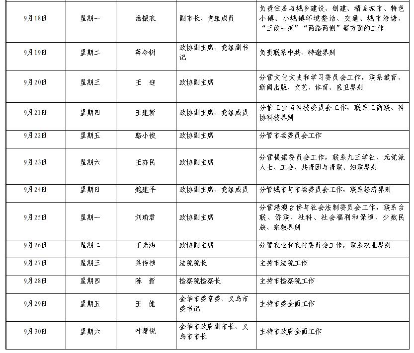 為深入貫徹黨的二十大精神,進一步暢通信訪渠道,方便群眾及時就地反映、解決問題,經(jīng)研究,決定開展市領(lǐng)導(dǎo)值守接訪活動,F(xiàn)將2023年9月份市領(lǐng)導(dǎo)接訪安排計劃公布如下: 一、接訪時間:上午9:00-11:00、下午14:30-16:30。 二、接訪地點:義烏市社會治理中心(香山路399號) 三、接訪領(lǐng)導(dǎo):詳見《2023年9月份義烏市領(lǐng)導(dǎo)干部接訪安排計劃表》(附后) 四、其他事項 (一)接訪安排可能因工作沖突等原因出現(xiàn)調(diào)整,具體接訪領(lǐng)導(dǎo)以調(diào)整后的為準(zhǔn)。 (二)來訪群眾請遵守《信訪工作條例》規(guī)定,應(yīng)攜帶身份證件、提供相關(guān)書面材料。多人共同上訪的,應(yīng)當(dāng)推選代表反映,代表人數(shù)不超過5人。來訪群眾提出的信訪事項,必須客觀真實,對其所提供材料內(nèi)容的真實性負(fù)責(zé),不得歪曲、捏造事實,不得誣告、陷害他人。接訪后,來訪人要主動離開接訪地點,不得纏訪,不得擾亂接訪秩序。 (三)鎮(zhèn)、街道每月一次安排市領(lǐng)導(dǎo)下訪約訪,時間每月15日開始,安排三天分三批錯時進行(遇節(jié)假日順延),信訪群眾可提前到所屬鎮(zhèn)街信訪辦預(yù)約。 2023年9月義烏市領(lǐng)導(dǎo)干部接訪安排計劃表
