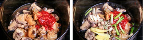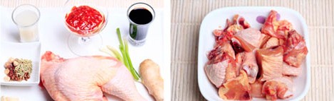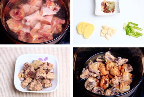原料:雞腿、蔥、姜、蒜、香蔥、米酒一杯、海鮮醬油一杯、香油拌的剁椒醬、花椒、大料、小茴香、草果。
