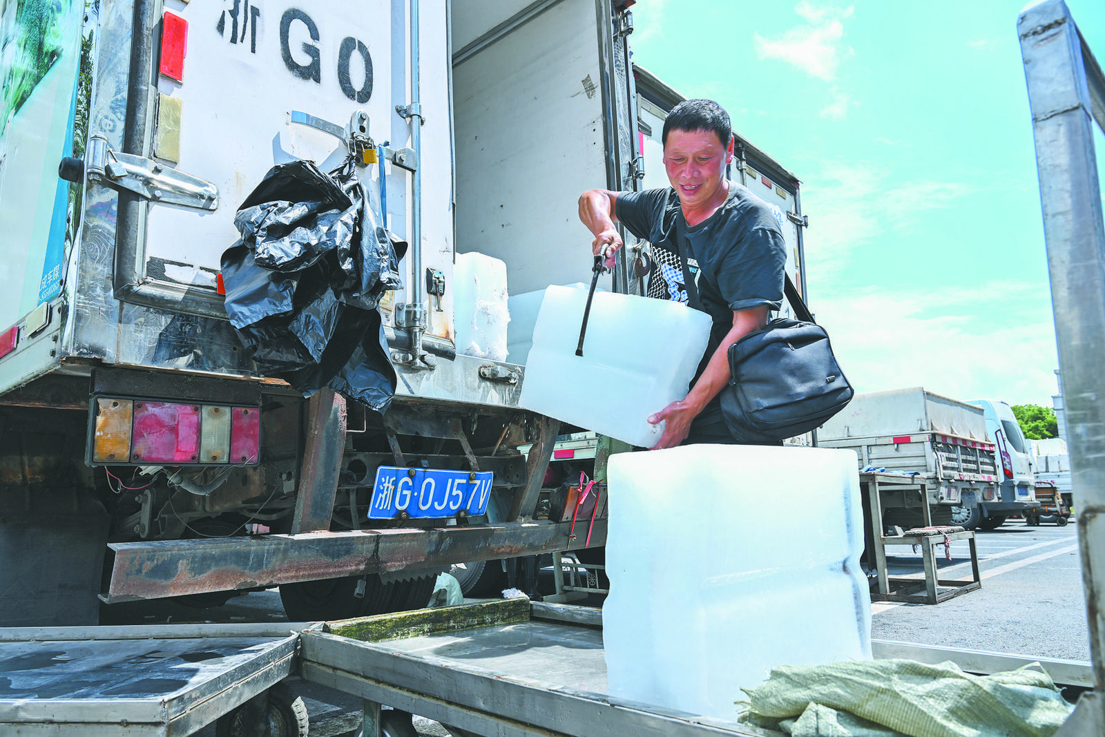 連日來(lái),烈日當(dāng)空,暑氣逼人,當(dāng)空調(diào)成為大多數(shù)人的避暑首選時(shí),“清涼擔(dān)當(dāng)”——冰塊正助力整座城市的夏日運(yùn)轉(zhuǎn)。 8月4日下午,義烏市冰亞冷凍食品有限公司(以下簡(jiǎn)稱(chēng)“冰亞冷凍”)的生產(chǎn)車(chē)間內(nèi),涼意陣陣襲來(lái)。制冰機(jī)正將冷凍成形的冰塊脫模,輸送至傳送帶,工人們則在另一端熟練地接應(yīng),將冰塊裝車(chē)運(yùn)走。這批冰塊是當(dāng)天上午開(kāi)始制作的,經(jīng)過(guò)近10小時(shí)的冷凍,被送往義烏及周邊地區(qū)的菜市場(chǎng)、工廠和商超。 “冰亞冷凍”負(fù)責(zé)人王惠琴?gòu)氖轮票袠I(yè)已有20年。她告訴記者,暑期是他們的產(chǎn)銷(xiāo)旺季,訂單量比淡季增長(zhǎng)5倍左右,當(dāng)天生產(chǎn)的冰塊當(dāng)天就能售罄。“如果氣溫超過(guò)35℃,需求量會(huì)更大。我們的4臺(tái)大型制冰機(jī)24小時(shí)錯(cuò)峰運(yùn)轉(zhuǎn),確保供應(yīng)不斷檔!蓖趸萸僬f(shuō)。為了提高生產(chǎn)效率,今年該公司更新了制冰設(shè)備,全自動(dòng)生產(chǎn)線讓產(chǎn)能翻了一倍,人工成本也有所減少。現(xiàn)在一個(gè)班次只需要3名工人,但能完成過(guò)去6個(gè)人的工作量。 記者了解到,“冰亞冰凍”的4臺(tái)大型制冰機(jī)每天能產(chǎn)出3600塊標(biāo)準(zhǔn)塊冰。單個(gè)塊冰重達(dá)105斤,出廠溫度保持在零下2.8℃的低溫狀態(tài),確保在運(yùn)輸和使用過(guò)程中維持最佳降溫效果。 “在室內(nèi),一塊冰可以維持15小時(shí)左右的降溫效果。戶(hù)外使用時(shí)間約10小時(shí)。”王惠琴介紹,塊冰在室內(nèi)配合電風(fēng)扇使用時(shí),降溫幅度可達(dá)6℃左右,特別適合高溫環(huán)境下的應(yīng)急降溫。 除塊冰外,“冰亞冷凍”還提供碎冰加工服務(wù)。碎冰生產(chǎn)線每小時(shí)可產(chǎn)出500包至600包,每包38斤,主要用于菜市場(chǎng)海鮮攤位的保鮮。 在詞林菜市場(chǎng)三文魚(yú)攤位,記者注意到,一排排新鮮的三文魚(yú)被放置在用碎冰搭建的“冰臺(tái)”上,攤位負(fù)責(zé)人李宜超向記者展示了他們的保鮮秘訣!叭聂~(yú)最理想的保鮮溫度是1℃至2℃,這樣不僅能保持最佳口感,還能最大程度鎖住鮮味!睘榱吮WC食材品質(zhì),他們每天上午開(kāi)市前和下午客流高峰前各更換一次碎冰。“每換一次冰要用掉4包至5包碎冰,加上給顧客打包時(shí)提供的冰盤(pán),日均消耗碎冰9包! 這種用冰降溫的智慧,不僅存在于菜市場(chǎng),更走進(jìn)了城市商業(yè)空間。轉(zhuǎn)過(guò)幾個(gè)街區(qū),在義烏天地購(gòu)物中心的中庭,一個(gè)由數(shù)十塊晶瑩冰塊拼成的巨型“COOL”字樣吸引著往來(lái)顧客的目光!皭灍岬氖彝,看到這么多冰塊,心理上就先涼快了一半!睅е鴥鹤庸浣值膹埓禾m笑著說(shuō)。在冰塊裝飾旁,有人伸手感受冰塊的涼意,有人忙著拍照打卡,感受這份夏日限定的清涼驚喜。 對(duì)冰塊的旺盛需求,催生了冰塊配送員這一特殊的職業(yè)群體。義烏市中心菜市場(chǎng)二樓,何國(guó)良拉著裝滿冰塊的小車(chē)一趟又一趟地穿梭在攤位之間。作為冰塊配送員,他每天要往返冰庫(kù)和菜市場(chǎng)數(shù)十趟,從凌晨3點(diǎn)工作到傍晚6點(diǎn)。 何國(guó)良告訴記者,菜市場(chǎng)的用冰需求呈現(xiàn)明顯的“雙高峰”特征。凌晨3點(diǎn)至6點(diǎn)是海鮮批發(fā)的高峰期,活鮮運(yùn)輸需要大量冰塊保鮮。下午4點(diǎn)至6點(diǎn)則是蔬菜攤主集中補(bǔ)冰的時(shí)間,用于延長(zhǎng)未售完蔬菜的保鮮期!白蠲Φ臅r(shí)候,我和搭檔一天要送兩車(chē)冰塊,差不多有250塊!焙螄(guó)良說(shuō)。 |