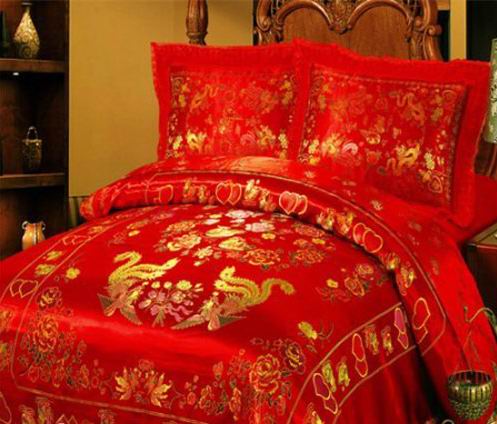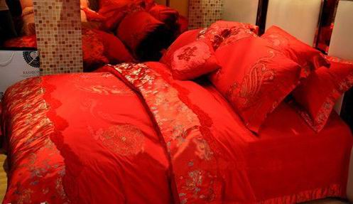 接下來可是比較傳統(tǒng)的風(fēng)格了,新婚的兩人正襟危坐,心里小小幻想著將來的甜蜜生活。而在家里,一切的一切都由長輩們忙活著,而這傳統(tǒng)的龍鳳呈祥可是家長們的首選,這是一種中華文化的最直接的體現(xiàn)。望子成龍、望女成鳳,這高貴的一龍一風(fēng)天生般配,當(dāng)然是象征著這登對的小兩口子。華麗麗的正紅色一下子就烘托出新房的喜慶。還有什么好考慮的呢?