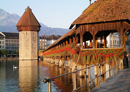 琉森(luzern)地處瑞士的中心,拉丁文意為“光”,即光城。據(jù)文獻(xiàn)記載,公元840年琉森被稱作“盧西亞麗亞”(luciaria),名字來源自一個(gè)關(guān)于光的傳說。據(jù)說天使以一束光,指引第一批居住在此的人建造小禮拜堂的位置。那時(shí)它只是一個(gè)小漁村。公元8世紀(jì)建城后,意大利商人越過阿爾卑斯山,來此經(jīng)商,遂形成城鎮(zhèn)。1332年加入瑞士聯(lián)邦,從此,走上繁榮之路。 有水的城市才顯靈氣,瑞士許多著名城市都是逐水而建,且有著相似的格局:一條大河穿城而過,河水注入湖中,于是城市就在河水和湖水的交匯處繁榮起來。琉森就是這樣。對(duì)那些不了解瑞士的人來說,在琉森可以得到最真實(shí)的印象。除了水,琉森的另一大誘惑就是山,巍峨的皮拉圖斯山在琉森周邊次第綿延開來。在雪山的映襯下,水邊的琉森更顯嫵媚動(dòng)人,有一種獨(dú)特的情調(diào)。 琉森具有21世紀(jì)的現(xiàn)代化,更具有中世紀(jì)所特有的美、和諧及生命力。這里街頭隨處可見各種各樣的特色面具,市內(nèi)古老狹窄的街道和廣場,到處是令人駐足的商店。市內(nèi)不乏文藝復(fù)興時(shí)期及巴羅克式的建筑物及噴水池。廣場均以鵝卵石鋪砌,人字形的小屋,墻上是五顏六色的花草彩繪,清新而美麗。琉森的老城是一定要悠悠地轉(zhuǎn)一轉(zhuǎn)的,那窄窄的街道,適合步行。沿河及湖邊漫步,一路都可見到一座斜跨在河面上的木制廊橋——卡貝爾廊橋。 羅伊斯河把琉森分為新老兩區(qū),河上共有七座橋,其中最知名的一座就是琉森的地標(biāo)——卡貝爾廊橋。它建于1333年,長約200米,橫跨在湖上的廊橋形似彎月。老橋是三角形的木質(zhì)屋頂,下面的柱子立在水中。這也是歐洲最古老的有頂木橋。橋頂鑲繪有120幅古畫,每幅畫下有一首德文題詩,描述了瑞士聯(lián)邦和琉森的歷史,也記錄了當(dāng)年流行的黑死病。該橋1993年8月曾遭火災(zāi),所幸尚未全毀,現(xiàn)已修復(fù)如初。和卡貝爾廊橋相對(duì)的是八角形水塔塔樓,它曾是古代軍用的瞭望臺(tái),如今游人也可入內(nèi)參觀。 廊橋臨老城一側(cè)的岸邊大都設(shè)著露天的咖啡屋或餐廳,人們可以隨意坐在桌旁,一邊用餐一邊欣賞湖光山色。水面上悠然游弋著幾只雪白的天鵝,在這里,人和這些優(yōu)雅的生物獲得了和諧,一起安然享受著上天恩賜的美景。 |