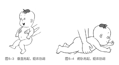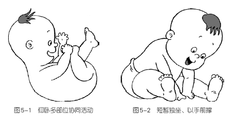 1. 大動作的發(fā)展規(guī)律 仰臥時,手、腿、腳、口的同時運動。 俯臥時,可以用雙手支撐體重,頭和胸進一步抬高。能夠單獨坐一會兒(幾秒鐘),前傾時兩只手開始在前面支撐,脊柱胸段后凸并向下延伸,第二個彎曲——胸曲開始形成。 站立姿勢時,能夠使勁站在地面上,可以在母親的腿上跳躍,由于腳部用力,使得頸部充分伸展。到這個時候,一個平躺的人逐漸過渡為直立的人。 垂直抱起時,較前2個月(4~5個月)自如。 俯臥水平抱起時,較前個月自如。 2. 促進大動作發(fā)展的小游戲 【游戲】 ●●游戲名稱:蕩秋千 ●●訓(xùn)練目的:感知空間位置的變化。 ●●訓(xùn)練方法: 把寶寶放在毛毯上,毛毯距床面30 ~ 40 厘米,父母兩人拉住四角輕輕來回“蕩秋千”;或抱寶寶到戶外的搖車上“蕩秋千”;也要讓爸爸把寶寶抱在懷里伴著音樂左右來回晃動,幅度由小變大。每天1次,每次2 ~ 3 分鐘。 |