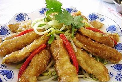 3.炒勺上旺火燒熱,注入植物油25克,將蔥、姜稍煽后倒入湯加干辣椒、白糖和余下的醬油、料灑把炸好的魚條也放進(jìn)去,用火煽待汁濃澆入香油即成。吃時挑去蔥、姜。 |