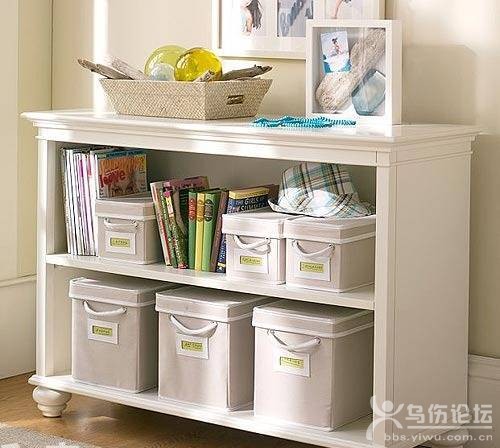 搭配二:開放式收納柜 開放式雙層收納柜,搭配一些結(jié)實(shí)耐用的帆布收納盒,將各種小物件整齊的收納起來,同時(shí)放置一些圖書,作為書柜,取用也非常方便。