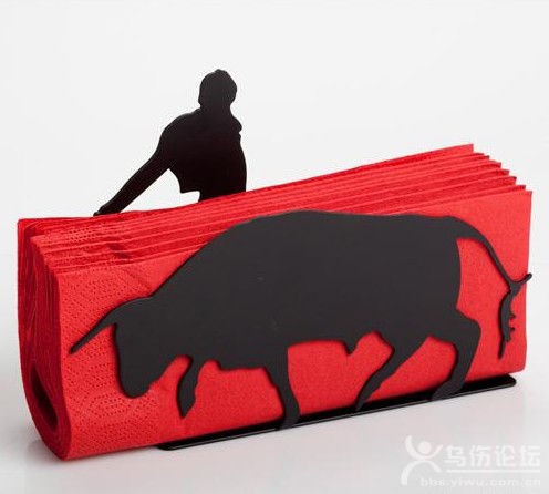 名稱:Napkin Holder斗牛士餐巾紙座 品牌:Nine Pencils 推薦理由:這款金屬制的餐巾紙架圖案靈感來自西班牙斗牛的運動,記得一定要搭配紅色的餐巾紙才更體現(xiàn)出它的特色哦,放上紅色的餐巾紙以后它就展現(xiàn)出一副動感十足的斗牛場景:姿態(tài)優(yōu)雅的斗牛士,略顯急躁的公牛都活靈活現(xiàn)。