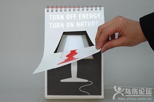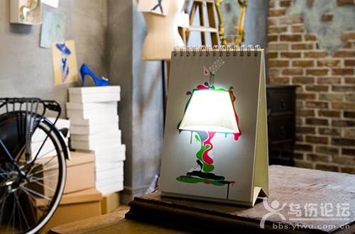 翻頁臺燈是由韓國Connect Design 帶來的創(chuàng)意。將一個電壓僅需5伏的LED臺燈裝置在臺歷中央,每翻動一頁就能給臺燈更換新的背景,同時你也可以自己在空白頁畫上圖案,讓臺燈外觀隨心所變。臺燈上帶有USB接口,與電腦連接即可實現(xiàn)照明。