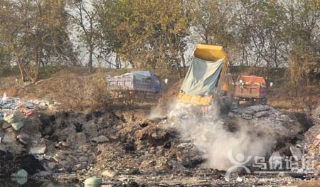 ![]() 池塘及周圍垃圾堆積成山,池水烏黑發(fā)臭。 ![]() 幾輛垃圾車正在傾倒垃圾,塵土飛揚。 近日,有讀者向本報反映,佛堂鎮(zhèn)雞脫鳳村旁一口池塘已變成巨型垃圾場,至今每天還有工程車往池塘里傾倒垃圾,給附近村民生活帶來了很大影響。 垃圾成堆,池水又黑又臟 為何會有人往村莊池塘傾倒垃圾?昨日下午記者前往佛堂了解情況。 雞脫鳳村在稠佛公里和五洲大道之間,緊靠義烏江,為佛堂鎮(zhèn)曉聯(lián)村的一個自然村。 說起這口垃圾池塘,不少村民怨聲載道,因為這“垃圾池塘”是死水塘,垃圾越倒越多。一口原本還算正常的池塘,即將被垃圾淹沒,還與周邊景色格格不入,環(huán)境污染嚴重。 在曉聯(lián)村一位村民的指引下,記者找到了雞脫鳳村村北的這口“垃圾池塘”,眼前的一幕,讓人驚訝。現(xiàn)場,幾堆垃圾正在燃燒,黑煙向雞脫鳳村飄去。該池塘長寬均在百米左右,四周堆放的多為拆除房屋后剩下的建筑垃圾,如磚塊、三合板、鋼筋水泥殘塊等,還有許多生活垃圾和廢舊布料,僅在池塘邊一角,就有近30捆用麻袋包著的黑色廢布料。 雞脫鳳村的黃大媽說,這個地方原來是一口村外野池塘,從上半年開始,就不斷有工程車將建筑垃圾傾倒在池塘里,這里漸漸變成了垃圾場!跋奶斓臅r候,不僅蒼蠅蚊子多,還有一股臭味”。 十分鐘開進5輛垃圾車 這是記者現(xiàn)場目擊的一景:一輛滿載建筑垃圾的工程車顛簸著開到這口池塘岸邊,車斗朝著池塘緩緩升起,所有垃圾順勢傾入池塘。不到10分鐘,又有4輛裝滿垃圾的工程車排著隊開到這池塘邊,4車垃圾全被倒在了池塘邊,揚起滿天塵土。然后,幾輛車先后揚長而去。 就在車輛離開的瞬間,3名男子快速沖上剛倒下來的垃圾,翻來覆去尋找著什么。記者上前詢問,他們說在找尋可以回收的廢品。 “我們每天都能在這兒找到一些可以回收賣錢的廢品,一天可得40多元!逼渲幸荒凶又毖圆恢M,幾乎每天都有車子往池塘里倒垃圾,有些垃圾可以賣錢,所以只要有車子進來倒垃圾,他們就有東西撿了。 與義烏江只有一岸之隔 在池塘西北側,記者看到一排高高的樹木,爬上去一看,發(fā)現(xiàn)這些樹木的另外一側就是義烏江。也就是說,這口“垃圾池塘”的岸邊和義烏江的江岸是連成一體的。據(jù)記者目測,義烏江與這口“垃圾池塘”的距離只有30米左右。 “池塘底下都是沙子,以前是不允許深挖的,現(xiàn)在傾倒的垃圾這么多,污水可能會滲入義烏江。”村民黃先生說,這口“垃圾池塘”跟義烏江連得近,極有可能污染義烏江水。 每天傍晚都會有人在池塘邊焚燒垃圾,惡臭難聞!澳切┤朔贌即蠹s在晚上6點到8點這時段,北風一吹,惡臭和污染物都飄向雞脫鳳村,村民根本無法正常生活?墒俏覀儾恢滥膫部門能管一管這事情! |