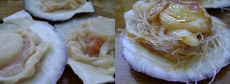 原料: 扇貝、粉絲、紅椒。 做法: 1、將扇貝的苦膽和周邊多余的紅肉祛除,洗凈擺放在殼中;