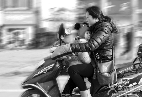 : 昨天下午,在義烏車站路上,一名小女孩站在電動自行車踏板上,靠在媽媽的懷抱里睡著了。年輕的母親雙腿夾著孩子,飛快地在車流中騎行。
