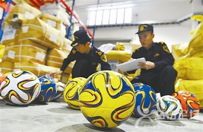 清點核對侵犯2014國際足聯(lián)世界杯官方標志的13100套足球服套裝