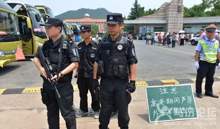 義烏中學(xué)考點(diǎn)外,市公安局巡特警大隊(duì)全副武裝的持槍特警站在通道口全程護(hù)考。