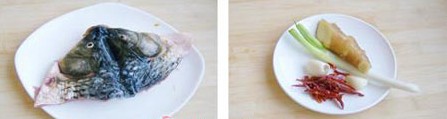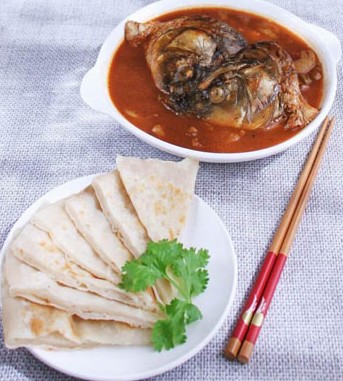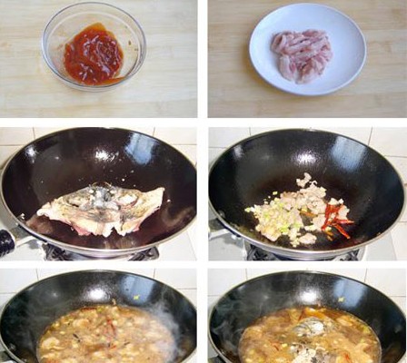 原料:鰱魚頭、五花肉、烙餅、蔥、姜、蒜、鹽、味精、醬油、料酒、香油、番茄醬、干辣椒。