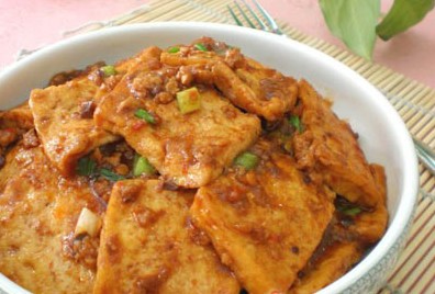 原料:老豆腐350克、豬瘦肉80克。 調料:生姜、大蒜、蔥花、干黃醬、郫縣豆瓣醬、雞粉、干淀粉、濕淀粉各適量。 做法: 1、老豆腐切成約0、4厘米厚的片,瘦肉剁碎成肉末,加入少許干淀粉抓勻;郫縣豆瓣醬剁碎,生姜與大蒜切成末,蔥切花; 2、熱鍋放油,將豆腐逐片放入,煎至兩面金黃后舀出待用; 3、鍋內再加入少許油,下入肉末炒到變色; 4、放入干黃醬、郫縣豆瓣醬、姜蒜末,炒勻后加入約100毫升水; 5、下入先前炒好的豆腐,炒勻后煮5分鐘; 6、加入少許雞粉炒勻,再放入蔥花、倒入濕淀粉炒勻即可。 |