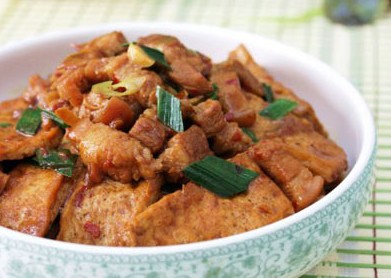 原料:老豆腐200克、五花肉150克。 配料:蒜苗、生姜、郫縣豆瓣醬、雞精、五香粉、老抽、料酒、濕淀粉各適量。 做法: 1、五花肉洗凈切成小塊,豆腐洗凈切成約0。3厘米厚的片;蒜苗斜切成段,郫縣豆瓣醬剁碎,生姜切成絲; 2、熱鍋放油,將豆腐逐片放入,煎黃一面后翻面,最后將其煎至兩面金黃后舀出待用; 3、鍋內(nèi)余油,下入五花肉,翻炒至肉變色; 4、下入兩小勺料酒炒勻,再放入郫縣豆瓣醬與姜絲,炒勻; 5、放入先前煎好的豆腐,放入兩小勺老抽,炒至上色; 6、加入沒過所有材料的開水,再加入適量的鹽、雞精、五香粉,蓋上鍋蓋,小火煮約20分鐘; 7、揭開鍋蓋后轉(zhuǎn)大火,將湯汁收濃一些后下入蒜苗,炒勻; 8、倒入濕淀粉,炒勻勾薄芡即可。 注: 1、郫縣豆瓣醬中含有鹽分,所以需酌量放鹽; 2、推薦五香粉一定要放,它會讓這道菜增香很多哦。 |