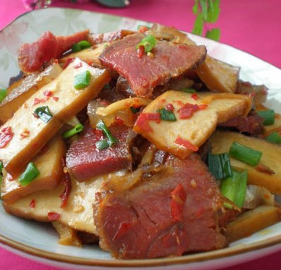 原料:湖南臘肉250克、臘干子60克、干辣椒、生姜、大蒜、蔥、雞粉各適量。 做法: 1、臘肉洗凈,放入鍋中加入適量的水煮約20分鐘; 2、將煮好的臘肉切成約0、2厘米厚的片,臘干子洗凈后也切成約0、2厘米厚的片,干辣椒洗凈去籽后切碎,生姜切絲,大蒜切粒,蔥切花; 3、熱鍋放入少許油(如果臘肉比較肥則不需放油),下入臘肉翻炒至出油; 4、下入臘干子、干辣椒、姜、蒜,炒出辣味; 5、加入適量的水,蓋上鍋蓋煮5分鐘左右; 6、放入蔥花及少許雞粉炒勻即可。 經(jīng)驗(yàn)分享: 1、將臘肉先煮再炒可以去除臘肉中多余的鹽分,不然是很咸的吶; 2、臘肉與臘干子中均有鹽分,所以此菜不需放鹽。 |