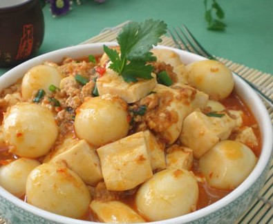 原料:嫩豆腐250克、鵪鶉蛋12個(gè)、豬瘦肉80克。 配料:郫縣豆瓣醬、生姜、大蒜、蔥、料酒、干淀粉、濕淀粉、生抽、雞粉各適量。 做法: 1、將鵪鶉蛋洗凈,放入鍋中加入適量的冷水用中火燒開(kāi)后再煮3分鐘,撈出泡入冷水中,待冷卻后將其剝殼待用; 2、將瘦肉剁碎成末,加入少許干淀粉抓勻;豆腐切成1、5厘米見(jiàn)方的小塊;郫縣豆瓣醬剁碎,生姜與大蒜切碎,蔥切花; 3、鍋內(nèi)加入適量的水燒開(kāi),加入少許鹽,放入豆腐煮2分鐘后撈出瀝干待用; 4、熱鍋放油,下入肉末炒至變色; 5、下入郫縣豆瓣醬與姜蒜末,炒出紅油后灑入兩小勺料酒,炒勻; 6、加入適量的水,再下入豆腐與鵪鶉蛋,蓋上鍋蓋,煮5分鐘; 7、加入適量的鹽,用鍋鏟推勻; 8、再加入適量的雞粉、生抽、蔥花,推勻; 9、倒入少許濕淀粉,推勻勾薄芡即可。 注: 1、煮鵪鶉蛋時(shí)火不要太大,中火即可,以免鵪鶉蛋破裂;將煮好的蛋放入冷水中浸泡一會(huì),比較容易剝殼; 2、豆腐事先放入加了鹽的沸水中煮,可以更好地去除豆腥味; 3、燒這道菜時(shí)盡量用鍋鏟將佐料推勻,這樣可以讓豆腐更好地保持完整。 |