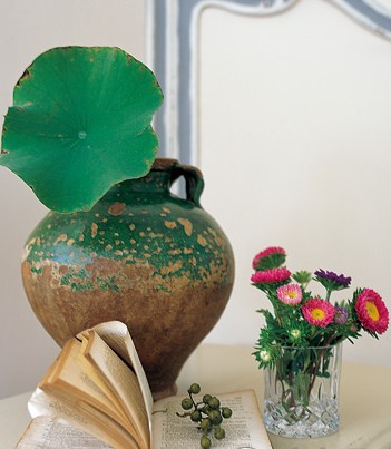 淘來(lái)的古樸陶罐,曾經(jīng)的綠色已經(jīng)消失殆盡;翻開的書籍,留下了時(shí)光的痕跡;即便那片本應(yīng)充滿風(fēng)情的荷葉,也并非完美?墒牵@又有什么呢?接納生活中那些不完美,新的甜美便會(huì)加入,比如正在綻放的那束小花!