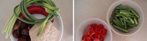 2、蒜苔、紅椒洗凈,蒜苔切段,紅椒切圈待用;
