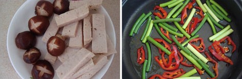 肉餅250克、鮮香菇8個、蒜苔、100克、紅辣1個、生抽1勺、鹽、雞精各1/2小勺、淀粉1勺、香油2大勺。