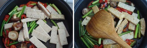 4、燒熱油,蒜苔和紅辣下鍋煸香;