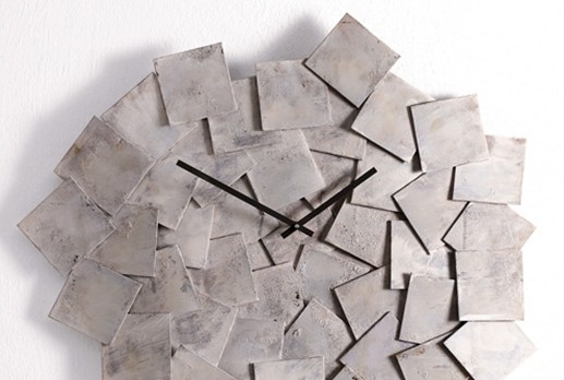 切割成正方形的金屬板,用不規(guī)則的組拼手法層疊做焊接,讓掛鐘顯得個(gè)性十足。