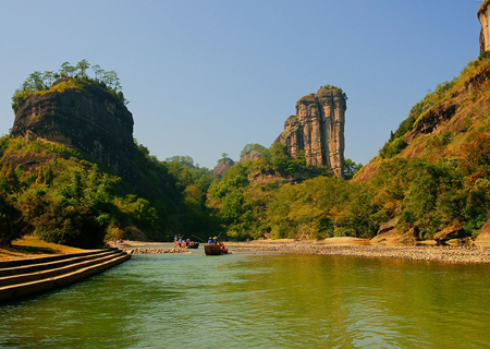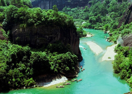 武夷山九曲溪發(fā)源于華東大陸最高峰——武夷山脈主峰黃崗山,全長60多公里,由西向東穿過武夷山景區(qū),盈盈一水,折為九曲,所以得名。