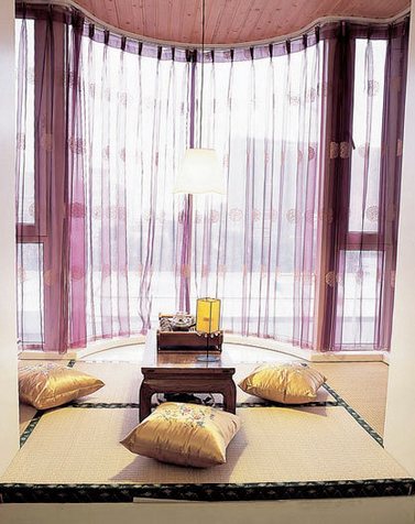 茶室——女主人的寶貝種類繁多、數(shù)量驚人。為了給他們安排個去處,設(shè)計師絞盡了腦汁:第一招是肆無忌憚的“侵略”。第二招是溫情脈脈的“霸占”。入戶門左手的墻面也被占據(jù)了,支架式的柜體、一道紫色的紗幔,暗藏在中式柜門里。各種雜物就被安放在這里,就連大塊頭的電冰箱也藏身在此!這是藏與露的游戲。一個藏一個露,一個含。