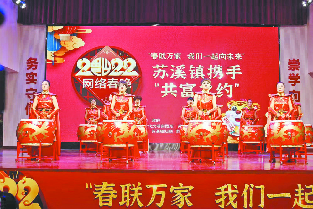 1月26日晚,“春聯(lián)萬家 我們一起向未來”2022蘇溪鎮(zhèn)攜手“以心迎新 共富啟航”網(wǎng)絡春晚在石塘文化禮堂開演。晚會以現(xiàn)場直播的方式與觀眾相約,播放量達23.53萬次,讓留在蘇溪過年的廣大市民朋友足不出戶就能享受精彩紛呈的文化盛宴。 開場舞《花廳大鼓隊》拉開網(wǎng)絡春晚的大幕,優(yōu)美的舞姿、動感的旋律,引得不少網(wǎng)友大贊“年味都要溢出屏幕啦”。晚會緊扣“共同富!敝黝},分為“物質富裕是基礎、城鄉(xiāng)富美是特征、生活富足是關鍵、精神富有孝義、社會富安新號角”五個篇章,串聯(lián)起舞蹈、歌曲、沙畫、書法、道情等多種表演形式。演員們歌聲嘹亮、舞姿優(yōu)美,整場演出異彩紛呈、歡樂祥和,帶領觀眾一起憶往昔、看今朝、展未來,全方面展現(xiàn)蘇溪人民為創(chuàng)造美好生活砥礪奮進的精神風貌。 “虎力全開,心想事成!本W(wǎng)絡春晚展示的新年祝福語,被吳曉剛截屏下并發(fā)送給遠在河南的父母。已在蘇溪工作6年的吳曉剛,今年第二次沒回老家過春節(jié)!敖衲隂]有回老家過年,但在蘇溪依然能感受到濃濃的年味!痹u論區(qū)里,不少網(wǎng)友不約而同地留下新年寄語,展望未來。 在晚會的第五篇章,現(xiàn)場設置了簽名環(huán)節(jié),蘇溪鎮(zhèn)六名聯(lián)合共建委代表上臺簽署了2022創(chuàng)業(yè)承諾書,為新一年的鄉(xiāng)村發(fā)展繪制藍圖立下“軍令狀”。代表們有力的筆觸、堅實的決心,伴隨著晚會的鄉(xiāng)村振興主旋律,一起聲入人心。 “回顧2021年,全鎮(zhèn)戰(zhàn)疫情、抓發(fā)展、惠民生,實現(xiàn)工業(yè)經濟生產總值達446億元!碧K溪鎮(zhèn)相關負責人介紹,本次網(wǎng)絡春晚作為蘇溪鎮(zhèn)留義過年五大場景——“添點樂”的重要活動之一,不僅展示了一場文化大餐和視覺盛宴,也帶大家領略了一個歡樂祥和、共富共美的蘇溪“富裕年”。 |