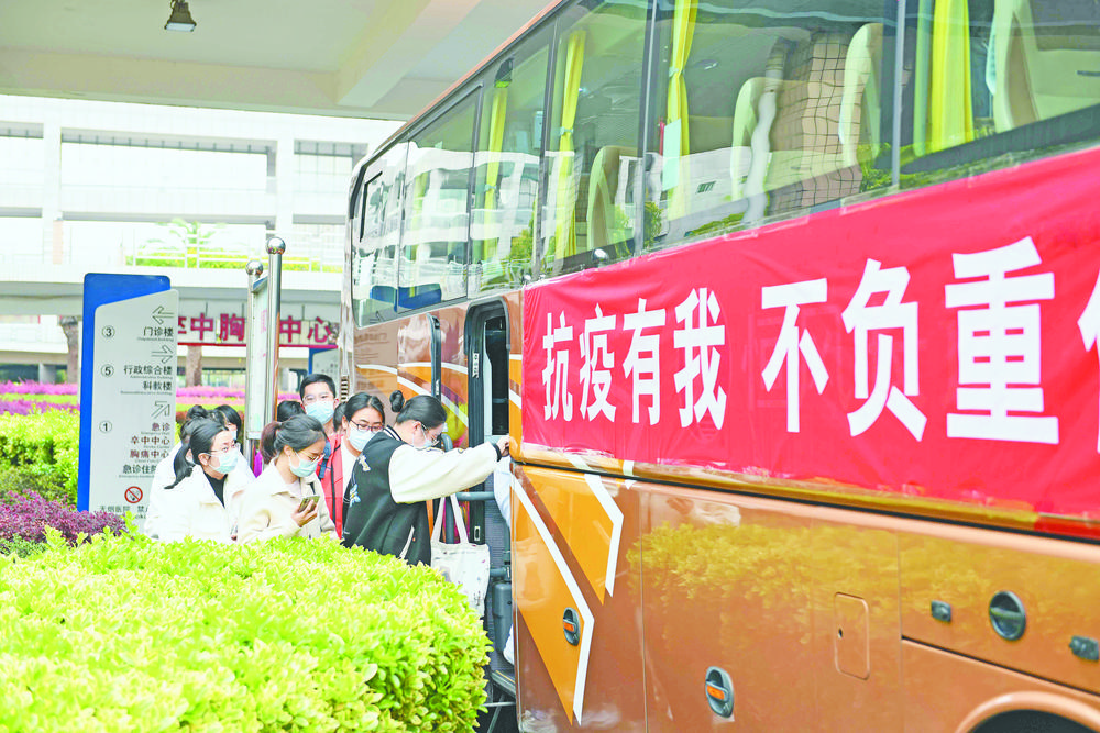 早上9點左右,浙大四院100人、市中心醫(yī)院100人、市中醫(yī)醫(yī)院50人、市婦保院50人組成采樣隊,從各自醫(yī)院乘坐大巴車出發(fā),前往蘭溪支援當?shù)貞?yīng)急核酸采樣任務(wù)。與此同時,10名來自多家醫(yī)院的檢測人員組成核酸檢測醫(yī)療隊,奔赴蘭溪支援。