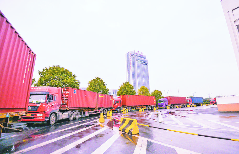 3月28日,義烏港內(nèi)車水馬龍,集卡車有序進(jìn)出,工人們忙著裝載貨物,一派繁忙景象。