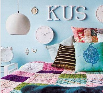 白色字母和掛鐘裝飾床頭墻面,讓墻面變得爛漫,并且具有立體的視覺效果。
