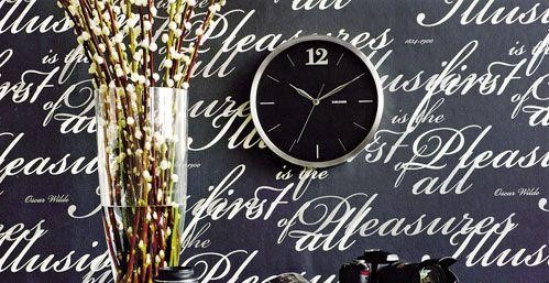 字母墻紙和黑色掛鐘組合裝飾墻面