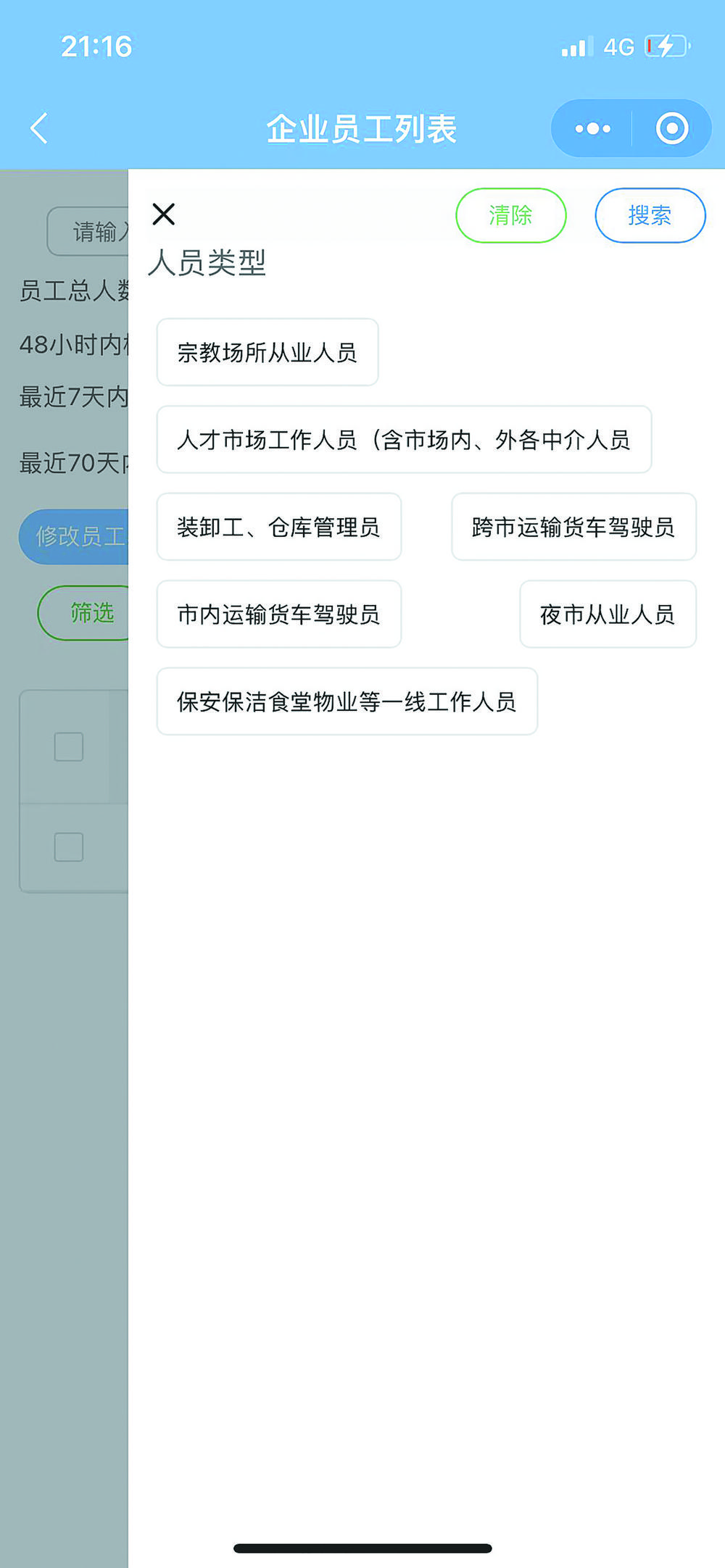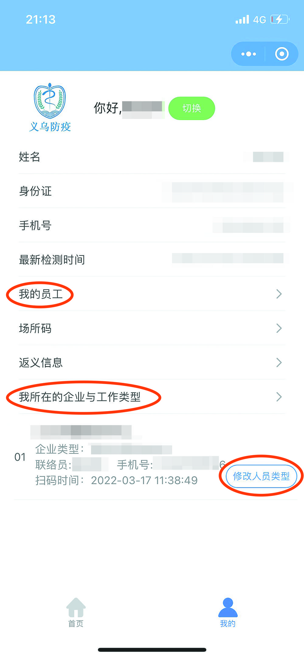 1.搜索并打開“義烏防疫”小程序。 2.點擊“企業(yè)防疫碼”進行申領,點擊“我的”可進入管理員界面。 3.點擊“確認”進入領碼信息填寫界面。 4.填寫領碼信息,企業(yè)類型必須選擇正確。 5.如果企業(yè)類型等信息填寫錯誤,可點擊“修改”。企業(yè)類型修改正確后,員工才能選擇正確的員工類型。 6.員工打開“我的”界面,可修改人員類型;聯(lián)絡員點擊“我的員工”,可進行員工管理。 7.員工點擊“修改類型”可進行修改。 8.企業(yè)聯(lián)絡員可在管理界面選中并單獨查看某個特定類型的員工,也可主動修改員工類型,或者將聯(lián)絡員轉讓給其他人,并一鍵短信提醒超期未做核酸的員工。 |