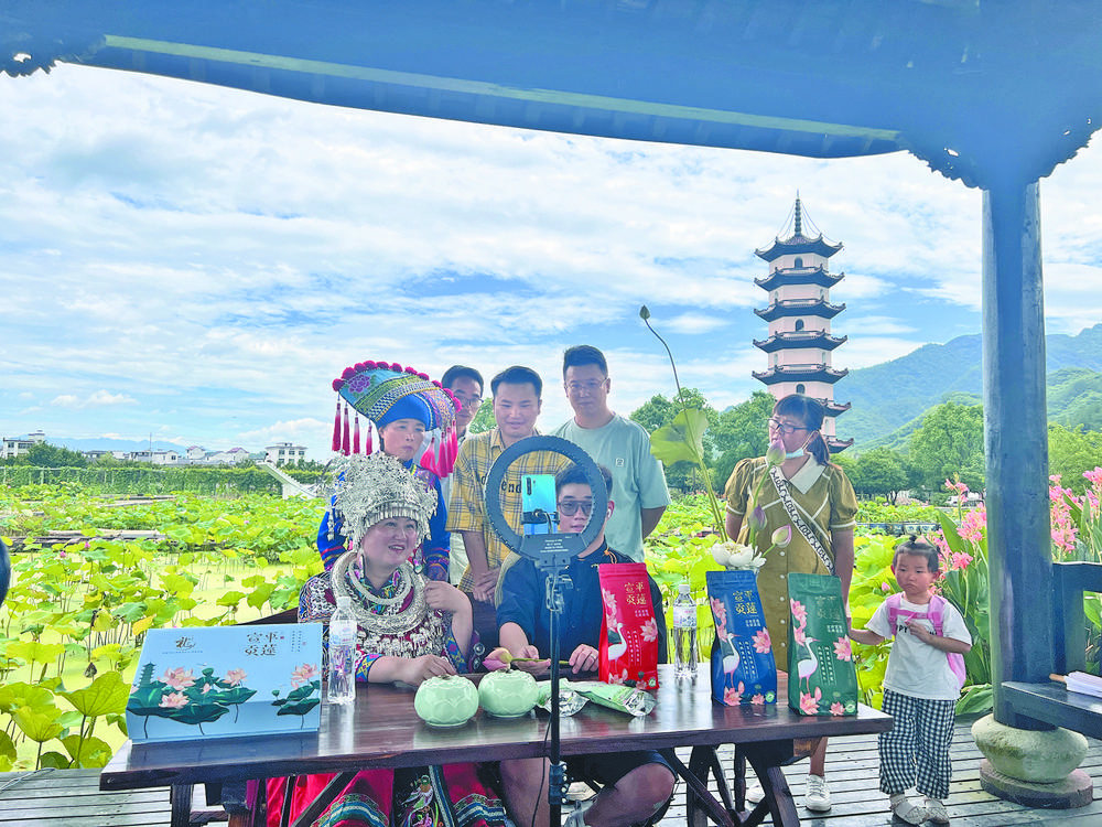 昨日,在武義江下畬鄉(xiāng)景區(qū),義烏“共富聯(lián)姻團(tuán)”的張莉(左一)正帶領(lǐng)當(dāng)?shù)厝罕婓w驗(yàn)直播。 當(dāng)天,義烏市民族團(tuán)結(jié)進(jìn)步促進(jìn)會(huì)和茉莉花工作室人員來到武義縣柳城畬族鎮(zhèn)江下村,以直播教學(xué)、直播帶貨等方式在十里荷花景點(diǎn)建立直播基地,推廣當(dāng)?shù)靥厣r(nóng)副產(chǎn)品,幫助少數(shù)民族群眾拓寬增收致富路。 |