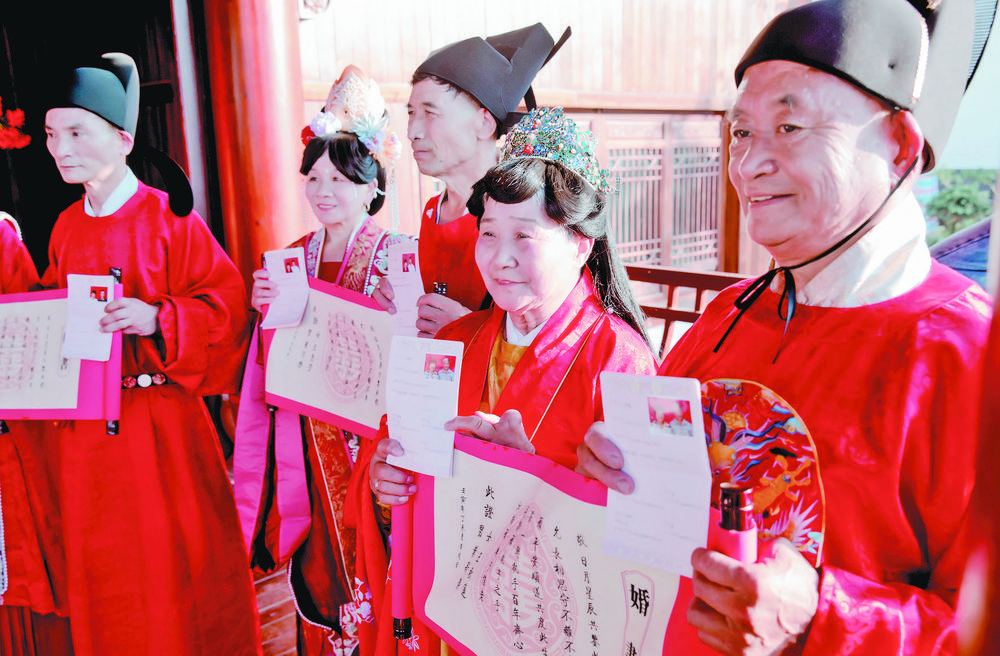 婚車巡游,披紅掛彩,滿載喜慶,美景佳偶。當天下午4時許,一場簡約而不簡單,莊重而不失浪漫的集體頒證儀式,在千年古鎮(zhèn)緩緩拉開序幕。紙婚、木婚、錫婚、銀婚、金婚……10對不同婚齡的夫妻撐著油紙傘,攜手漫步在愛情碼頭,同登愛的彼岸。熱鬧喜慶的“婚車”沿著古鎮(zhèn)河道行駛,引得岸上游客駐足觀看。一幕幕畫面定格,水街以晝景調(diào)墨,以喜色落款,在水光詩意和鑼鼓聲中,將古鎮(zhèn)婚典完美演繹。 在蒲川水街的老戲臺上,參與活動的夫妻在司儀的引導下,依次行洗塵之禮、登堂之禮、三拜儀式之禮等,市民政局、佛堂鎮(zhèn)為參與活動的夫妻頒發(fā)結(jié)婚證以及定制的傳統(tǒng)中式婚書,10對老夫老妻重新領證。 形式多樣而富有儀式感的頒證儀式,帶給“再次”領到結(jié)婚證的夫妻們,不一樣的登記體驗,他們的臉上始終洋溢著幸福的笑容。葉新榮和王秋蓮是參加集體頒證儀式的一對金婚夫婦,為了參加這次活動,夫妻倆早早就過來化妝彩排了。“今天是個意義非凡的日子,特別感謝民政部門為我們舉辦這樣一個美好的儀式,我會一輩子記在心中!蓖跚锷徴f,這樣領證儀式感滿滿,給他們留下珍貴的回憶。 據(jù)了解,自婚俗改革以來,市民政局創(chuàng)新開展結(jié)婚登記頒證服務,加強頒證場所建設,創(chuàng)設室內(nèi)室外頒證場所,設計文化內(nèi)涵豐富的頒證詞,組織舉辦集體婚禮、紀念婚禮等特色突出、文明節(jié)儉的創(chuàng)意婚禮,倡導和推廣體現(xiàn)優(yōu)秀中華文化的傳統(tǒng)婚禮,尊重婚俗禮儀的多樣性,使中華優(yōu)秀婚俗禮儀薪火相傳,為增強文化自信提供優(yōu)質(zhì)載體。 “佛堂鎮(zhèn)素有千年古鎮(zhèn)、清風商埠、佛教圣地的美譽,被評為中國歷史文化名鎮(zhèn),這次傳統(tǒng)的中式集體婚禮,將中國傳統(tǒng)建筑的美和中國傳統(tǒng)婚俗的美相結(jié)合,為大家呈現(xiàn)了婚姻從一年紙婚到五十年金婚的美好!狈鹛面(zhèn)社會事務服務管理辦公室負責人胡塵說,佛堂作為全市集中補證的試點鎮(zhèn)街,自5月24日開展集中補領婚姻登記證試點工作,通過分村精準動員、免費紀念留影等形式,截至目前已完成4300余對夫妻換證,同時也希望通過這次活動,讓全社會更加關注家庭、關注家教、關注家風,讓“好家風、好家教”深入更多家庭。 |
