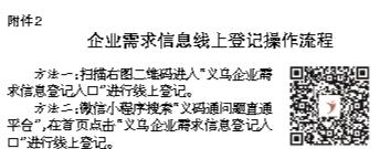 為深入貫徹落實(shí)中央、省委關(guān)于穩(wěn)住經(jīng)濟(jì)大盤系列決策部署,突出問(wèn)題導(dǎo)向、效果導(dǎo)向,進(jìn)一步提升“三服務(wù)”工作實(shí)效,根據(jù)金華市委、市政府和金華市穩(wěn)進(jìn)提質(zhì)工作領(lǐng)導(dǎo)小組統(tǒng)一安排,2022年7月15日(星期五)下午2:30—5:30,金華市委主要負(fù)責(zé)同志將率市四套班子有關(guān)負(fù)責(zé)人,在義烏市委黨校以市縣聯(lián)動(dòng)方式開展現(xiàn)場(chǎng)集中辦公,面對(duì)面幫助企業(yè)解決實(shí)際困難和問(wèn)題,義烏市內(nèi)企業(yè)可通過(guò)電話或線上線下等方式登記預(yù)約、有序參與。 登記時(shí)間:7月11日上午8︰30—7月14日下午5︰30。 登記方式: 1.電話登記:工作日時(shí)間(上午8︰30—11︰30,下午2︰00—5︰30),企業(yè)可通過(guò)聯(lián)系各鎮(zhèn)、街道經(jīng)濟(jì)發(fā)展服務(wù)中心或市政務(wù)服務(wù)中心(原行政服務(wù)中心)咨詢電話進(jìn)行登記。(見附件1) 2.線上登記:掃描二維碼或通過(guò)微信小程序搜索“義碼通問(wèn)題直通平臺(tái)”,在首頁(yè)選擇“義烏企業(yè)需求信息登記入口”進(jìn)行線上登記。(見附件2) 3.線下登記:前往市政務(wù)服務(wù)中心(原行政服務(wù)中心)一樓咨詢臺(tái)或各鎮(zhèn)、街道經(jīng)濟(jì)發(fā)展服務(wù)中心咨詢填報(bào)。 登記內(nèi)容:根據(jù)企業(yè)需求信息登記表?yè)?jù)實(shí)填報(bào)。 溫馨提示:參加人員健康碼應(yīng)為綠碼,行程卡無(wú)異常,無(wú)發(fā)熱、咳嗽等相關(guān)癥狀,并提供48小時(shí)內(nèi)核酸檢測(cè)陰性證明。 附件:1.企業(yè)需求信息登記咨詢電話 2.企業(yè)需求信息線上登記操作流程 義烏市“三服務(wù)”活動(dòng)領(lǐng)導(dǎo)小組辦公室 2022年7月10日 |
