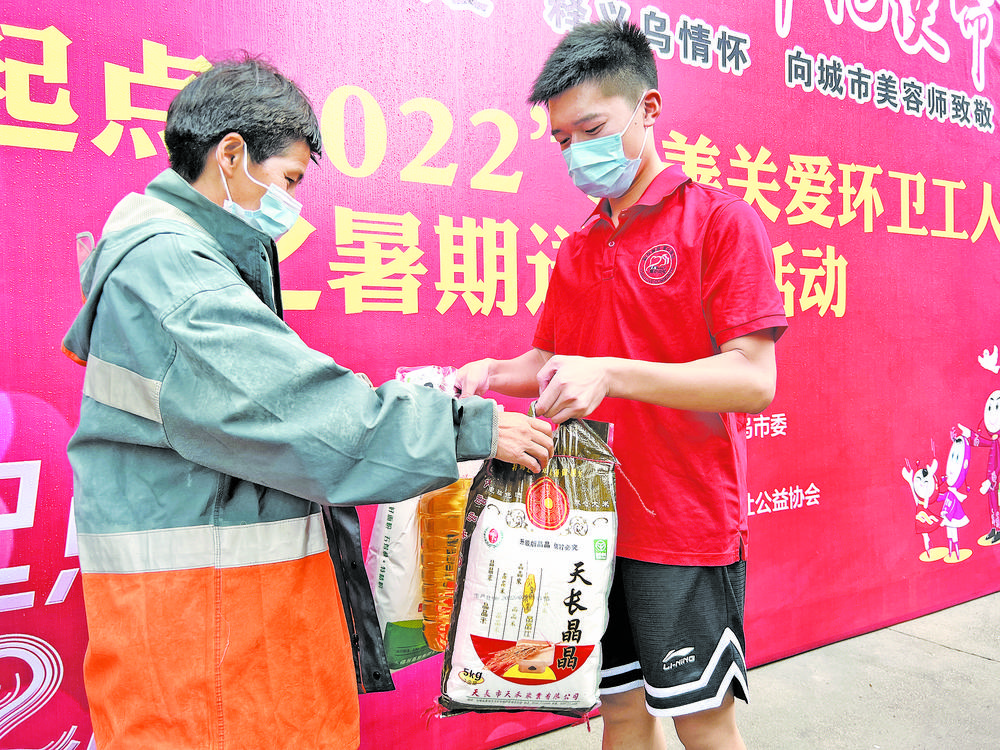 志愿者把物資送到環(huán)衛(wèi)工人手中。 7月19日上午,愛(ài)心公社為環(huán)衛(wèi)工人準(zhǔn)備了每人一份大禮包,環(huán)衛(wèi)工人可以到江東街道龔大塘三區(qū)領(lǐng)取。作為義烏第一批公益組織,愛(ài)心公社十年如一日地關(guān)注環(huán)衛(wèi)工人群體,與市慈善總會(huì)聯(lián)合啟動(dòng)慈善關(guān)愛(ài)環(huán)衛(wèi)工人公益項(xiàng)目,開(kāi)展環(huán)衛(wèi)工人愛(ài)心年夜飯、送清涼等一系列活動(dòng)。此次“新起點(diǎn)2022”慈善關(guān)愛(ài)環(huán)衛(wèi)工人之暑期送清涼活動(dòng)由市慈善總會(huì)、團(tuán)市委共同主辦,市環(huán)境集團(tuán)、愛(ài)心公社承辦。 據(jù)悉,往年,愛(ài)心公社志愿者都為環(huán)衛(wèi)工人送綠豆湯、清涼用品等,而今年他們通過(guò)愛(ài)心公社會(huì)長(zhǎng)基金以及愛(ài)心企業(yè)、愛(ài)心市民捐款,籌集10萬(wàn)元善款,為環(huán)衛(wèi)工人準(zhǔn)備了1000份大禮包。 愛(ài)心公社負(fù)責(zé)人趙云峰說(shuō):“這次的大禮包不僅有防暑藥品,還有大米、食用油、面粉等,都是根據(jù)環(huán)衛(wèi)工人的實(shí)際需求采購(gòu)的,其中800多份送給城東清潔服務(wù)分公司、城西清潔服務(wù)分公司的環(huán)衛(wèi)工人,還有100多份將由社區(qū)分發(fā)給社區(qū)保潔人員。” 來(lái)自河南的秦迎州和李雯霞是一對(duì)夫妻,2003年來(lái)到義烏后一直從事環(huán)衛(wèi)工作。秦迎州說(shuō):“在義烏當(dāng)環(huán)衛(wèi)工人很幸福,愛(ài)心市民、各單位都非常關(guān)心我們,每年都會(huì)給我們送來(lái)關(guān)愛(ài),我們會(huì)繼續(xù)做好本職工作,讓義烏更美麗! 愛(ài)心行動(dòng)還將繼續(xù)。趙云峰表示,環(huán)衛(wèi)工人是城市美容師,持續(xù)高溫天氣給他們的工作帶來(lái)了巨大挑戰(zhàn),因此希望通過(guò)這樣的方式,讓他們感受到社會(huì)各界的關(guān)愛(ài),也希望有更多的人來(lái)關(guān)注這些“城市美容師”。 |