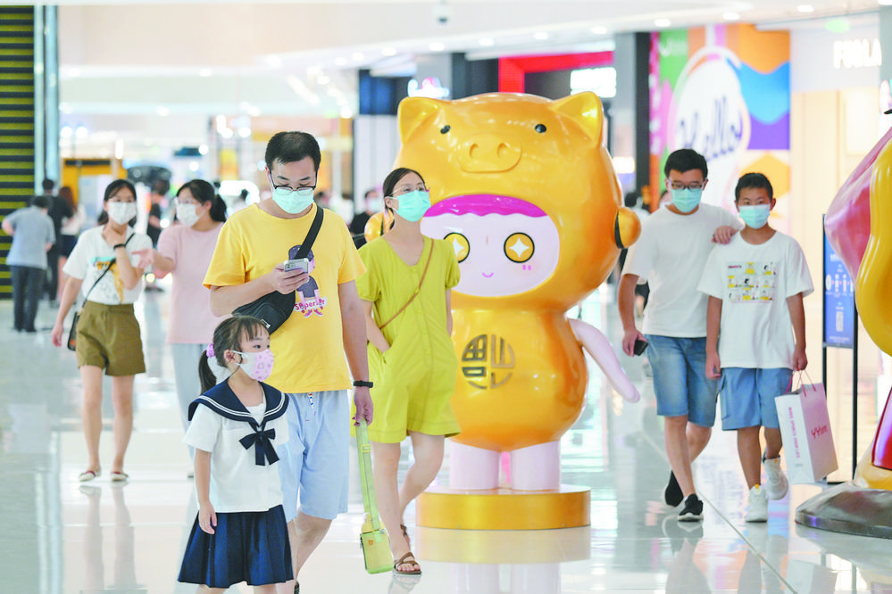 義烏之心,戴口罩的市民結(jié)伴逛商場(chǎng)。