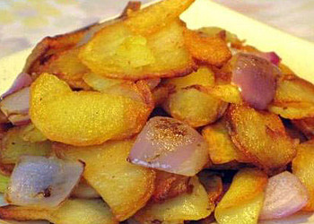 原料: 土豆三個(gè)、洋蔥半個(gè)。 調(diào)料: 鹽3克。 做法: 1、土豆去皮切片,用清水洗去表面的淀粉后濾干,最好再用干布或廚房紙抹干表面水份,洋蔥切片; 2、熱鍋入油,油溫后下土豆片先大火煸炒幾分鐘; 3、然后調(diào)中小火慢慢煸炒土豆片,注意經(jīng)常翻動(dòng),不要炒焦了; 4、當(dāng)土豆片煸成金黃色時(shí),加鹽調(diào)味炒勻; 5、接著下洋蔥煸炒,當(dāng)洋蔥炒軟煸出香味時(shí),出鍋裝盤(pán)即可。 |