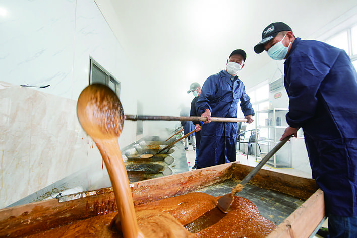 : 連日來,在義糖紅糖廠內(nèi),9口鐵鍋一字排開,來自義烏上溪鎮(zhèn)樓宅村的榨糖師傅手握長勺熬制紅糖。據(jù)悉,義烏上溪、義亭、佛堂等鄉(xiāng)鎮(zhèn)是糖梗主產(chǎn)地,有古法榨紅糖的傳統(tǒng)。