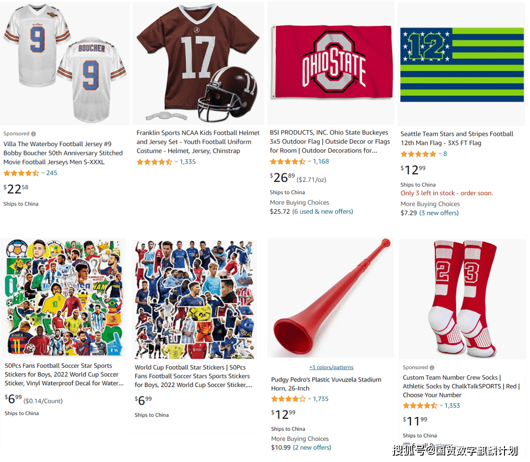 世界杯相關(guān)產(chǎn)品需求持續(xù)上漲 當(dāng)下,在亞馬遜官網(wǎng)搜索世界杯關(guān)鍵詞,各色商品琳瑯滿目,讓人眼花繚亂。賣家在產(chǎn)品上選擇大致分為兩個部分: 關(guān)于世界杯賽事的產(chǎn)品:帶足球樣式的獎杯、足球球衣、熱門球隊(duì)標(biāo)志等。 活動助興氛圍產(chǎn)品:貼紙、擺件和抱枕、鑰匙扣、腕帶等、哨子以及保暖單品。