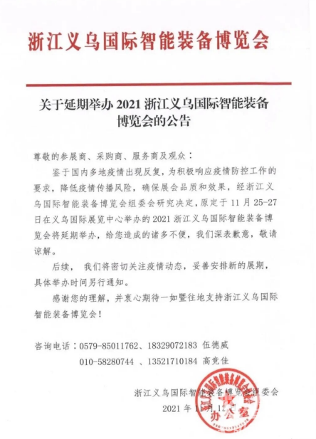義烏國(guó)際智能裝備博覽會(huì)延期舉辦了!