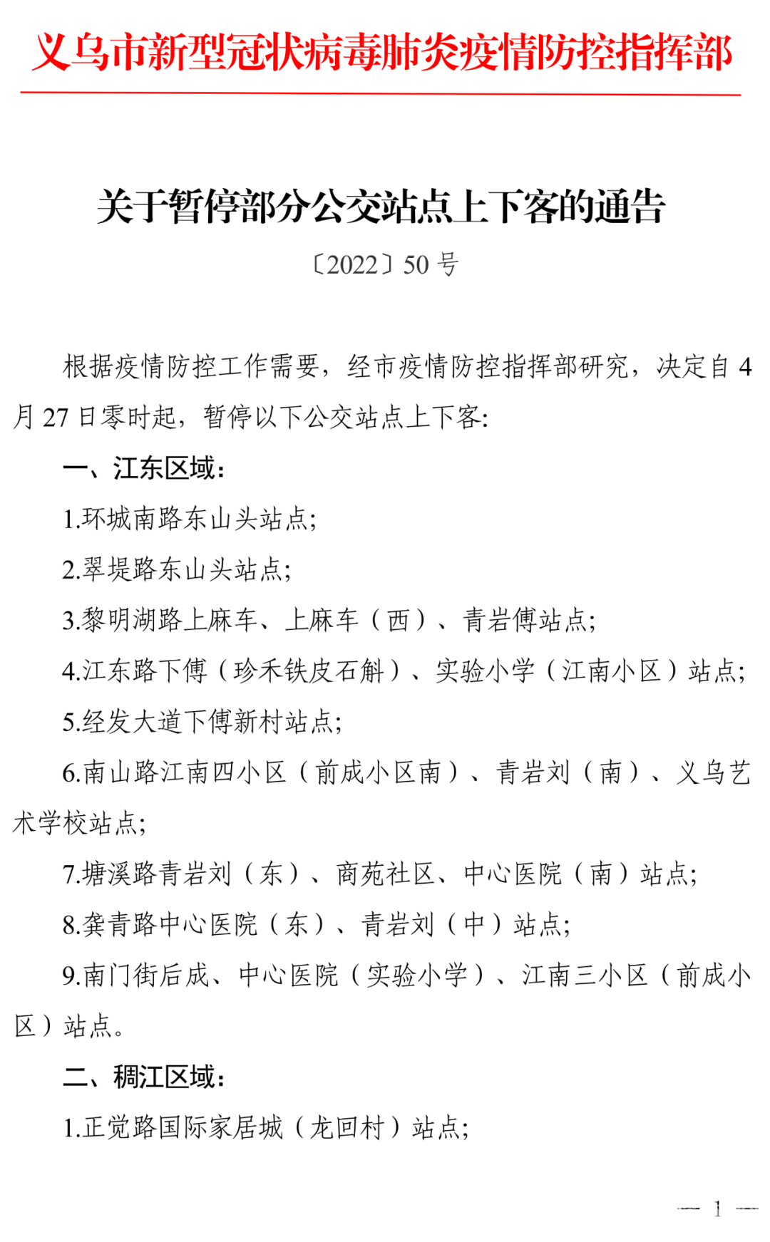 義烏關于暫停部分公交站點上下客的通告